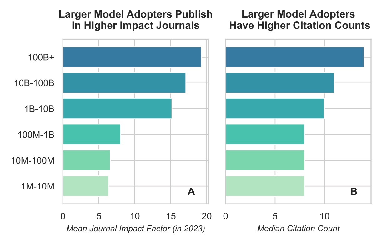 Of course, these differences only matter if newer, bigger models translate into better scientific outcomes in practice, not just in theory. And indeed, this is exactly what we find (though only correlationally). On average, since 2020, increasing the size of an adopted foundation model 10x corresponds to 1.3x more citations. That same 10x also corresponds to higher-quality journals, with an average increase of 2.3 points in journal impact factor.6