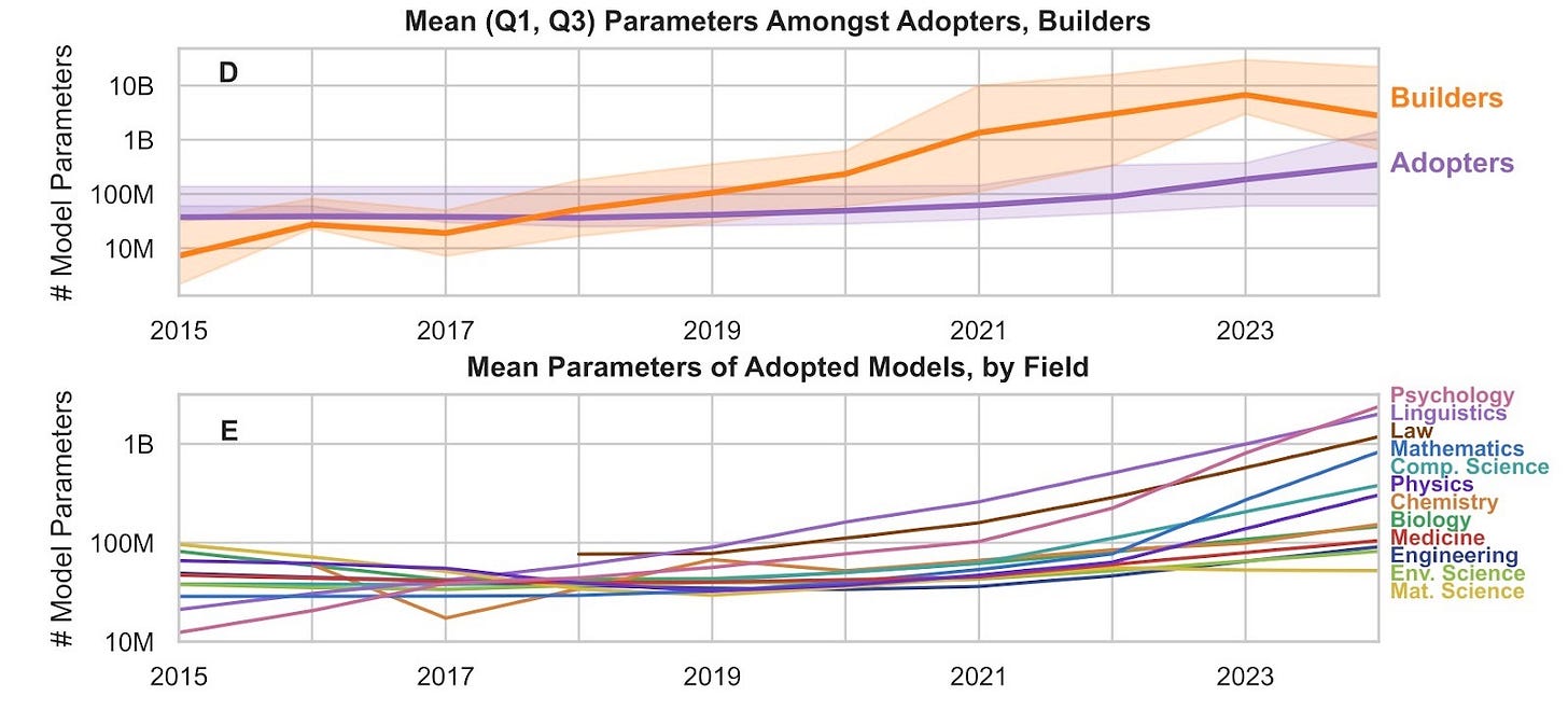 Some fields are doing better than others, though. Psychology, Linguistics, and Law lead the pack in 2024 as the only three fields adopting (on average) models with more than 3 billion parameters.5 Computer Science sits in the middle, while Materials Science, Environmental Science, and Engineering bring up the rear under 100 million parameters.