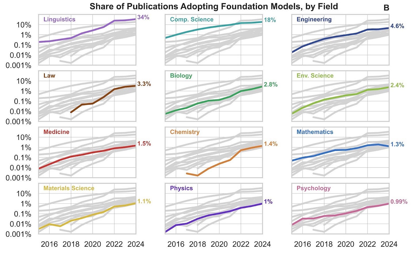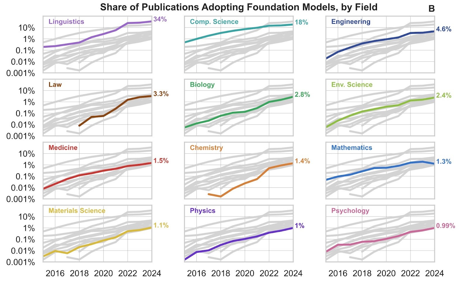 This trend isn’t restricted to a few strands of the literature either. We see staggering growth across all domains, from Computer Science and Engineering to Linguistics and Psychology. Among these fields, Linguistics (34%) and Computer Science (18%) stand out with the higher adoption rates, perhaps unsurprisingly.3 But nearly every field in our analysis reached 1% adoption by 2024 – domains like History and Sociology included – highlighting the diverse potential of foundation models across disciplines.