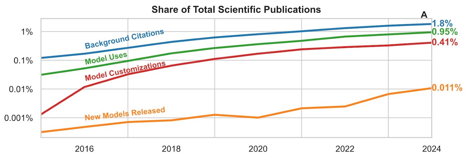 In our new paper The Rapid Growth of AI Foundation Model Usage in Science, we document this historical trend with unprecedented depth, tracking who has adopted which foundation models and how scientists deploy them in their methodologies. We construct the largest dataset of its kind – classifying 750 thousand academic citations of nearly 2 thousand foundation models across 250 thousand papers. In this post, we’ll not only demonstrate the staggering growth of AI in science over the last decade, but we’ll look under the hood at which models are used, how that impacts scientific outcomes, and why it matters. Expect to learn: