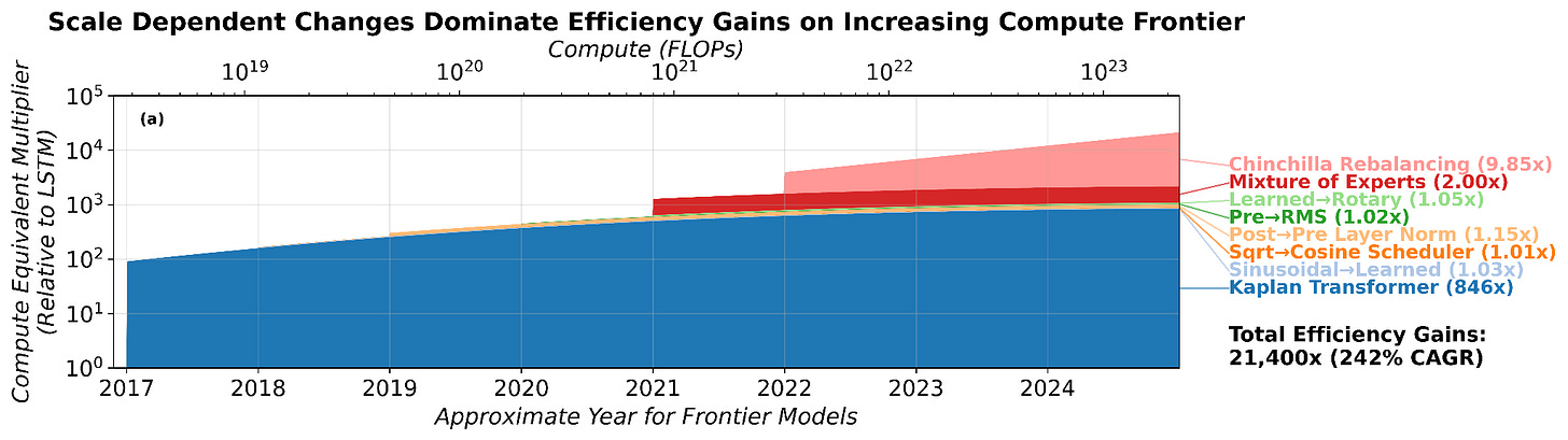Using an expanded framework which allows for this scale-dependence, our paper further breaks down the algorithmic innovations of the past decade into those which do and don’t depend on compute scale – and quantifies how much each matters. We show that most progress has indeed come from steadily increasing compute budgets, which makes Alice’s algorithm appear to be more and more efficient by comparison to Bob’s. This is in contrast to the dominant view in the literature, where progress comes from steady innovations in Alice’s algorithm.