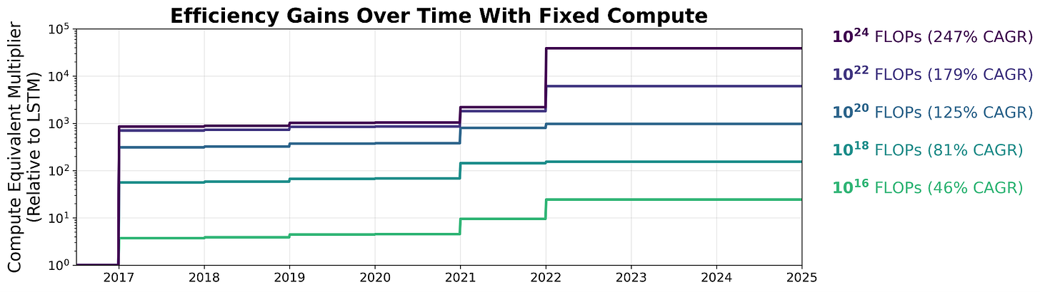 Our new paper provides strong experimental evidence against this view. We find that algorithmic efficiency is compute scale-dependent: some algorithms provide increasing – not constant – efficiency returns to scale. We estimate that from 2012 to 2025, as much as 91% of efficiency gains depend on (historically exponential) compute scaling, meaning that if compute scaling had not occurred, algorithmic innovations alone would yield less than 10% of the efficiency improvements we measure today.